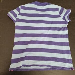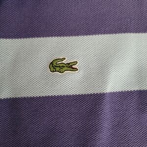 Chic Lacoste polo with purple and light blue stripes. Ideal for casual wear.