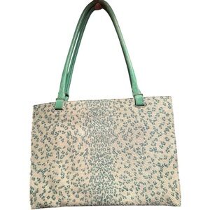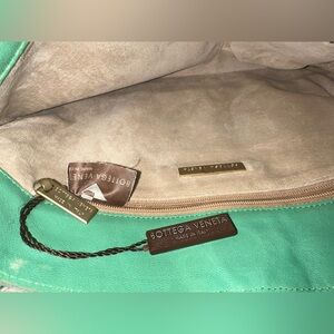 Stylish Bottega Veneta tote with a teal and cream pattern. Perfect for adding a touch of elegance.
