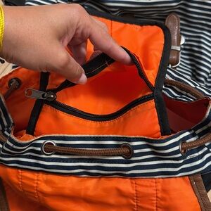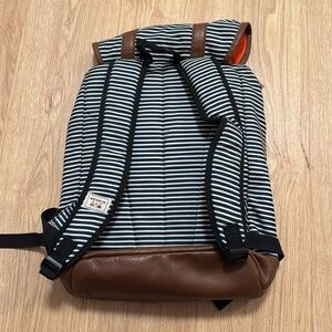 Stylish backpack featuring a classic striped design with brown accents. Perfect for everyday use.