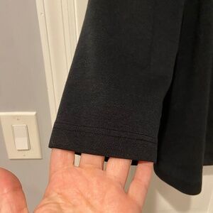 Avenue women’s black collared sweatshirt in size 22/24. Made from a soft and comfortable blend of polyester, rayon, and spandex for stretch and ease of wear. Features a zip-up front, but zipper is broken (as shown in pictures). There is also a small hole near the zipper pocket on the chest that can easily be repaired with a few stitches.