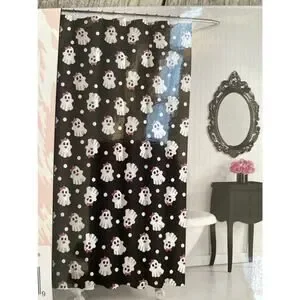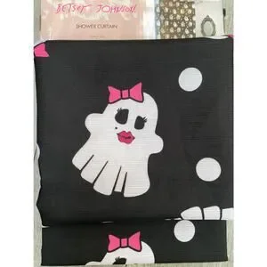 Add playful spooky charm to your bathroom with the Betsey Johnson “Sassy Ghosts” shower curtain. Featuring white ghosts with pink bows, bold lashes, and red lips on a black background with white polka dots, this 72” x 72” polyester curtain makes a stylish Halloween or year-round statement.