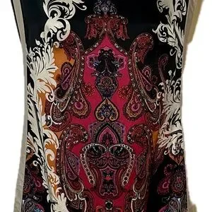 Bebe - This beauty was my go-to top when exploring art galleries in New Orleans. Its stunning multicolor paisley pattern meets a sophisticated boat neck for gorgeous lines that look oh so chic! The fabric is 100% silk, and comes with an optional metallic silk wrap. The sides are split for ease of fit around your hips, which also makes it a little sexy. Pair with jeans or sleek black trousers. Perfect for petite ladies who appreciate unique style and elegance.