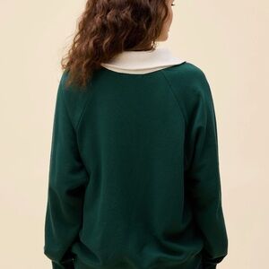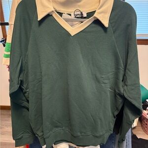 Chic V-neck sweater in forest green. Features a stylish cream collar. Perfect for versatile wear.