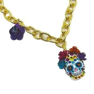 Whimsical Day of the Dead (Día de (los) Muertos) Skull necklace on chunky gold-tone chain.