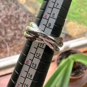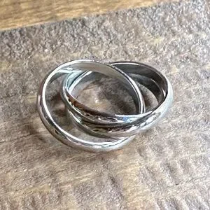 Description from the website: Inspired by a world-famous designer, UNITE ring is comprised of three permanently entwined brilliant silver tone bands. UNITE is the perfect accent ring for any finger, including the thumb!