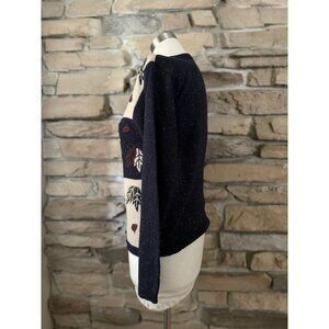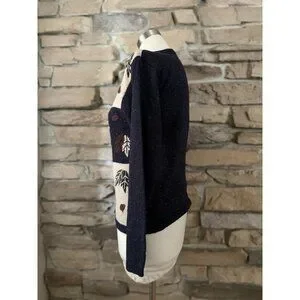 This cozy Dressbarn zip-front cardigan sweater features a charming fall-inspired design with color-blocked navy and beige panels decorated with embroidered leaves and acorns. Perfect for autumn layering, this sweater blends warmth, style, and comfort.