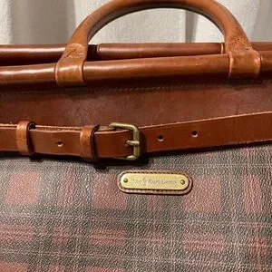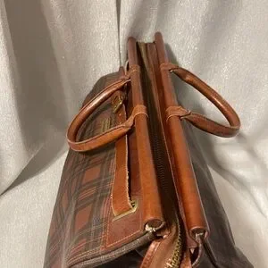 Handsome Vintage RALPH LAUREN Brown and Black Tartan Plaid. Coated Canvas and Leather, Top Open Weekend Bag. Zipper Closure with Leather Strap Reinforcement. Clean canvas lined interior with zippered pocket. Rich brown leather accents. Base studs for protection. Weekend travel size.