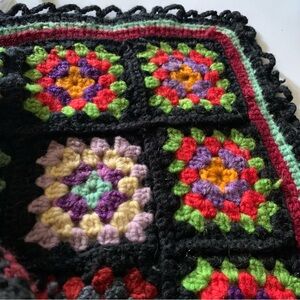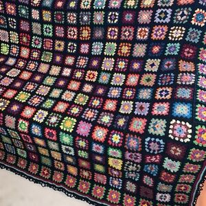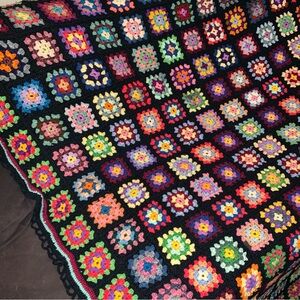Beautiful black blanket with granny squares in all the colors, green, red, purple, blue,……, colorful & very comfy
