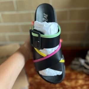 Chic black sandals with vibrant straps. Features a bold buckle design. Perfect for casual outings.