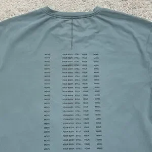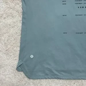 Features: Half logo print of Lululemon in all caps on front and repeating text Move Your Body. Still Your Mind. on back, ending with a half logo print of Lululemon in all caps. Lulu logo on back left.