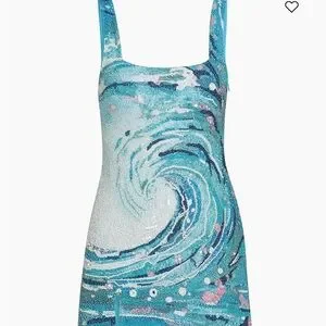 Eye-catching mini dress with a wave pattern. Features shades of blue and pink. Perfect for a bold look.