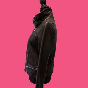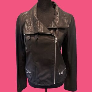 Pre-owned All Saints Bales Biker Motorcycle Jacket size US 8. Smooth Black Lamb Leather with multiple zippers, full zip up front and double buckles at neck to create a fantastic modern Motorcycle Jacket.