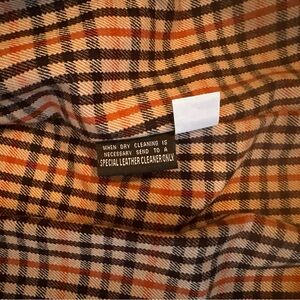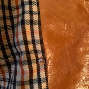 Genuine leather coat in camel brown tone finish. Fully lined with chic plaid fabric in a blend of orange, black, and cream tones. Perfect for so many stylish options. Well made. Excellent, mint condition!