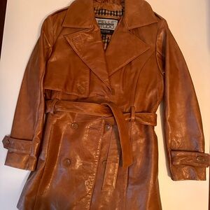 Genuine Leather Trench Coat. Fully lined with Plaid Patterned Fabric. Size XS
