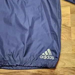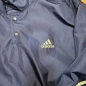 Retro Adidas men's windbreaker pullover jacket in size Large. This lightweight shell features a snap-button collar, iconic white 3-stripes down the sleeves, breathable mesh lining, and adjustable drawcord hem. A classic piece for athletic or streetwear style.