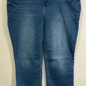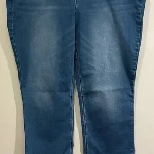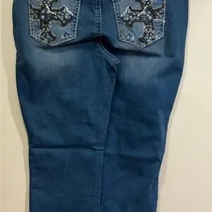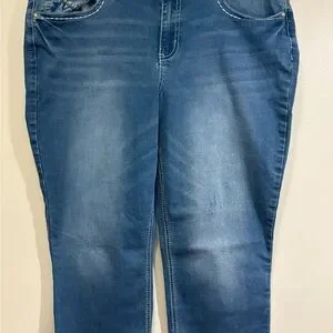 Stylish boot cut capris in blue. Features decorative back pockets. Perfect for everyday wear.