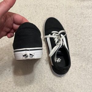 Iconic Vans sneakers with a black canvas upper and white accents. Features a classic lace-up design.