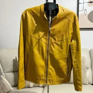 Stylish mustard faux leather jacket. Features sleek zipper closure. Ideal for a modern look. Inside of the collar is a little damaged but unnoticeable when wearing it.