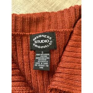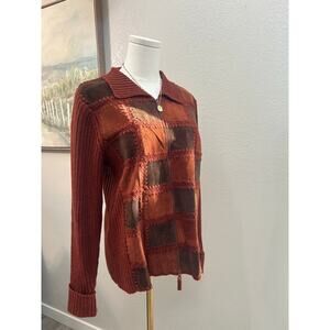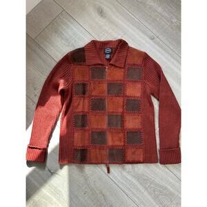 Y2K / Early 2000s Patchwork Leather & Knit Jacket by Designers Studio Originals zip-up jacket in a rich rust-brown color with genuine leather patchwork on the front and cozy ribbed knit sleeves and back. Collared neckline, full front zipper, and unique textured stitching for a retro boho feel. Perfect fall statement piece.