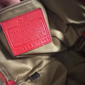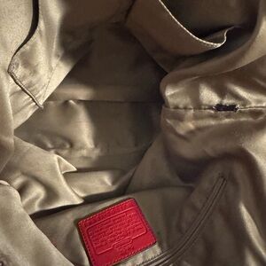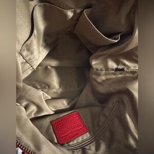 Exterior: hang tag, brass accents, hidden front zipper pocket, decorative buckle accents, brand pin mount.