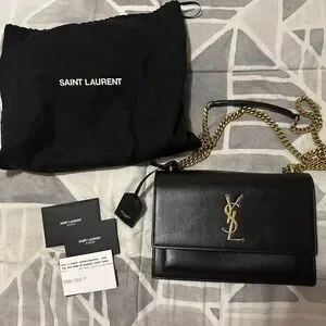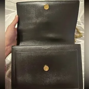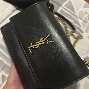 Gorgeous authentic Saint Laurent Sunset bag in the medium size, crafted from smooth black leather with stunning gold-tone hardware. Features the iconic interlocking YSL logo, front flap, and versatile leather/chain strap that can be worn crossbody or doubled on the shoulder.