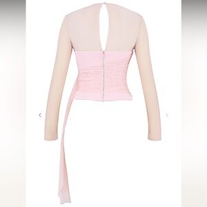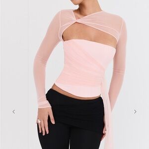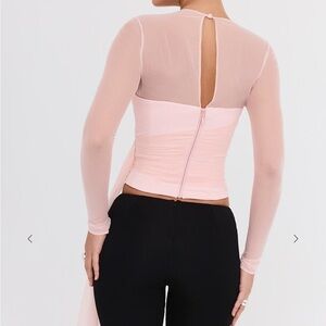 Our pretty peony top is fully corseted for a cinched in waist and cut from stretch crepe. The soft mesh shoulder overlay creates a revealing cutout to the front and drapes beautifully across the bodice, falling below the hem for a floaty finish.