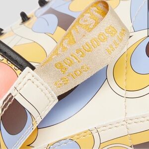 Vibrant lace-up boots with a colorful pattern. Features yellow, blue, brown, and white designs.