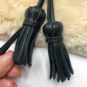 Rare vintage Juicy Couture clutch wristlet has a soft cream fur with a black leather flap that has juicy couture embossed into the leather. Cute fringe tassels, light pink satin lining with 1 zip pocket and 2 inside pockets, and 1 outer pocket with removable wristlet. Magnetic closure. Small red marking on inside and juicy couture metal tag has been removed. See pics. Size: 12" Width by 7" High. Retail 295.