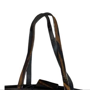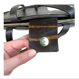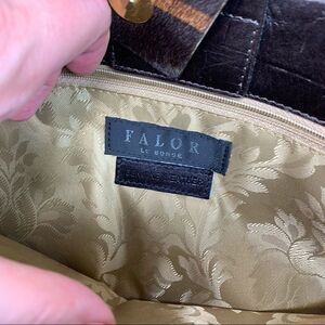 A Falor dark brown crocodile embossed leather handbag with calf hair straps and closure. The bag is in excellent condition and doesn't appear to have ever been carried. There is some calf hair loss on one of the straps (last photo). Leather body of purse shows no wear. Inside is clean and shows no wear. Falor hang tag still attached. Made in Italy.