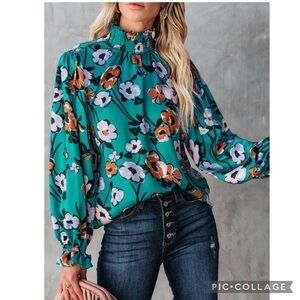 🍁🍂🍁 Beautiful Fall Colors. Teal, Copper, Lilac Floral Print Top. Top has high ruffled neck & ruffled cuffs. Stops @ end of waist. 100% Poly
