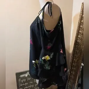 Chic black blouse with colorful floral print. Features 3/4 tiered ruffle sleeves and off-shoulder design. Ideal for stylish outings.