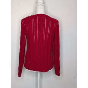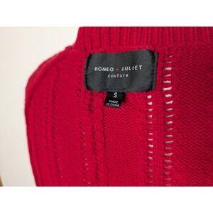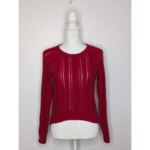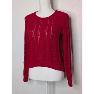 This Romeo & Juliet Couture Women's Cropped Ribbed Open Knit Sweater in size Small features a red color with an open-knit pattern. It has a round neck, long raglan sleeves, and is made of a cotton and acrylic blend. This pullover sweater is perfect for casual occasions in winter, fall, or spring, offering a classic style with breathable comfort.