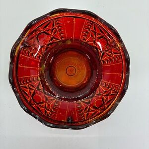 The Vintage Indiana Glass Ruby Red Flash Stars and Bars Fairy Lamp is a round, medium-sized candle holder made of glossy red glass in the 1960s. This collectible piece features a stars and bars pattern with a flash character, perfect for all occasions and any room in the house. From the late 20th century, this original piece is a unique addition to any collection and represents a nostalgic era of decorative design. Made in the United States by Indiana Glass, this fairy lamp is a charming and stylish way to display mini candles. **PLEASE NOTE** This is a used vintage item. As shown in the pictures the red flashing is flaking off in areas. No chips were noticed during inspection, only a slight grinding on the scalloped edge (as shown in the pictures). Questions are always welcome!