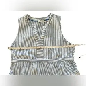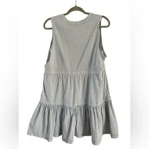 Elegant midi dress with vertical stripes. Features a sleeveless cut and tiered skirt. Ideal for summer days.