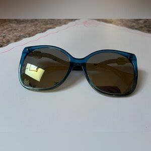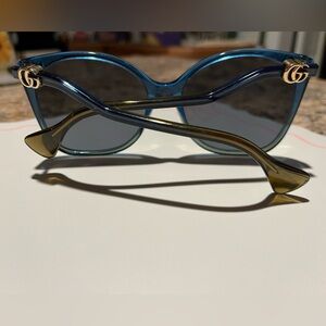 Experience luxury with these Gucci sunglasses, showcasing a bold oversized frame in a stunning blue shade, accented with elegant gold details. The amber-tinted lenses not only enhance visual contrast but also provide superior glare reduction. Perfect for those who seek both style and functionality in their eyewear.