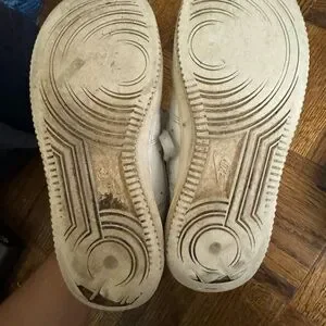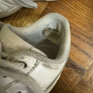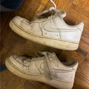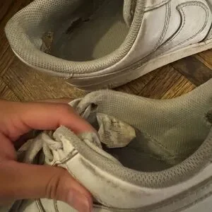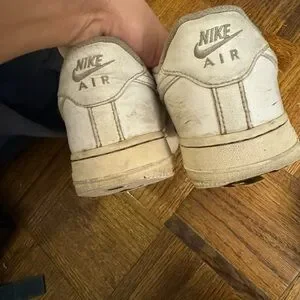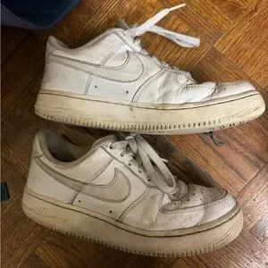Beat up Air Force 1s. Clearly very very worn in. Hole in the back of the shoe and on the sole. Women’s size 7. Still wearable