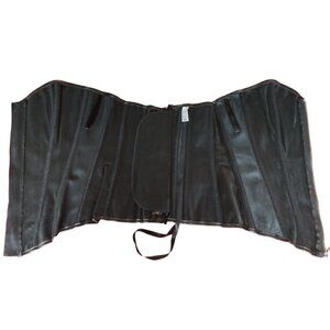 Brand New Zip Front Faux Leather Corset with matching thong and hair tie Features laced corset back and full zipper down the front. Sizing is a bit large, please see measurements below. Great for photos, cosplay, parties, etc. New in plastic packaging, in perfect condition with no damage noted.