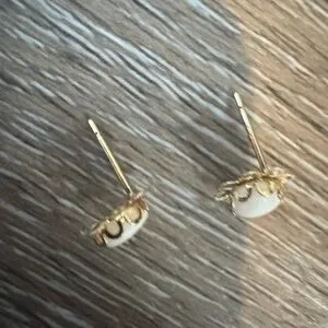 These stud earrings are 14K gold and have a floral filigree design surrounding a common opal cabochon