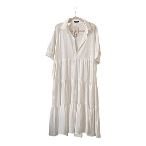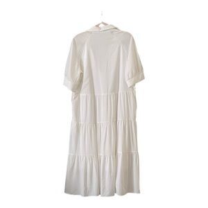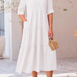Discover elegance with this white tiered midi dress, perfect for any occasion. Its classic design offers a sophisticated and timeless appeal.