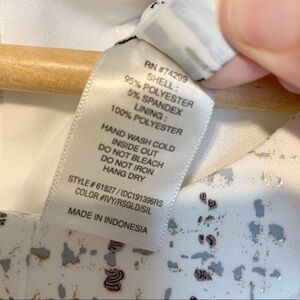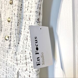 Enfocus Studio vintage style dress. Specs of mauve, gold and silver print all over with off white or eggshell base. Has faux gold crest buttons down the front. Fitted through the top that flares out at waist slightly with darts. Does have stretch to it for movability. Zip up closure in the back.