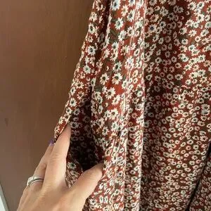 Rust-colored dress with white floral pattern. Features a comfortable fit with pockets!