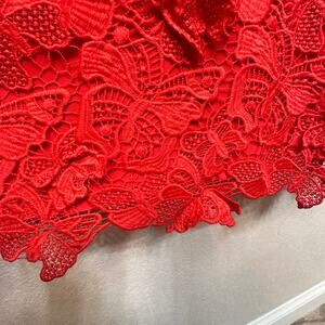 This vibrant poppy red mini dress features a sleeveless design with a flattering v-neckline, complemented with lace butterfly details. It's a shift dress style that hugs the body, offering a chic and sophisticated look. The intricate lace fabric adds a touch of elegance, making it a standout piece for any occasion.