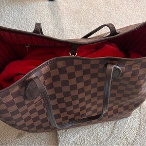 This is good pre-loved condition there is a tiny mark on front see picture not noticeable there are no tears on piping Handles are in great condition The Neverfull GM tote Crafted from elegant Damier Ebene canvas with natural cowhide trim, it is ultra-roomy but never bulky, with side laces that cinch for a sleek allure or loosen for a more casual look. Slim, comfortable handles slip easily over the shoulder or arm. Lined in colorful textile
