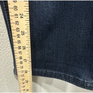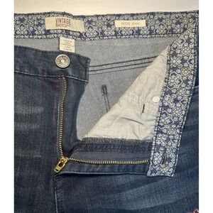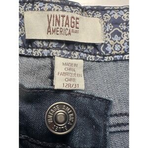 The Vintage America Blues Jeans in women's size 12/31 feature an embroidered Aztec design, giving them a unique and bohemian flair. Made of a cotton blend denim fabric, these mid-rise jeans have a 5-pocket design and a regular fit. The dark wash and solid blue color add to the vintage-inspired look, perfect for all seasons. The brand's model, Vintage America Bestie Jean, combines retro themes with a touch of Southwestern style, making these jeans a stylish choice for casual wear.