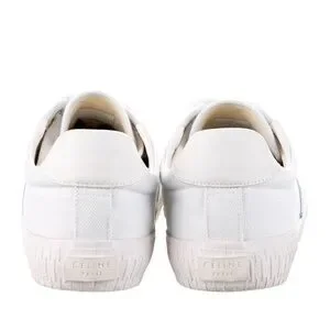Stylish Celine sneakers. White base with blue accents. Lace-up design. Comfortable and trendy.