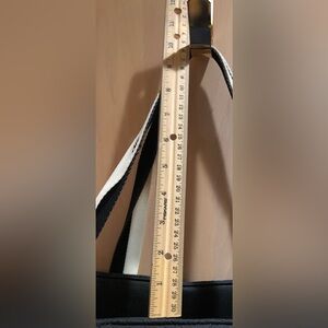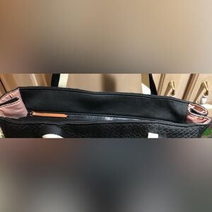 Stylish black quilted large tote bag featuring cream straps. Perfect for everyday use but stylish. This bag is a workhorse! It’s large and carries a lot which is why I call it a utility bag. You can adjust the size by snapping the sides. It has zipper closure. It’s made of polypropylene which means you can pretty much wipe with a wet cloth to clean. There’s a mark inside which I photographed and a little coffee mark on the interior of the shoulder strap. I’ve lowered the price to account for the wear.