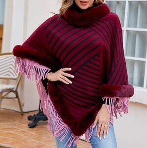 Plush Faux Fur Retro Fringe Stripe Pullover Oversized Warm Knit Poncho Cardigan Top