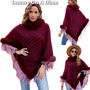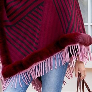Plush Faux Fur Retro Fringe Stripe Pullover Oversized Warm Knit Poncho Cardigan