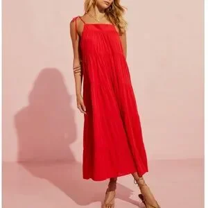 Elegant red tiered maxi dress with shoulder ties. Perfect for any occasion.