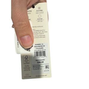 These are Calia Inspire Collection High-Rise 7/8 Leggings, size XL, in the "Precious Mineral Multi Print". The leggings are new with tags and in excellent condition. They feature a high-rise waistband and a fitted silhouette that hits at the ankle. The material is a blend of polyester and LYCRA® ADAPTIV, providing a second-skin feel and lightweight support. The leggings also have side pockets for storing Designed to support both casual wear and intense workouts, the CALIA Women's Inspire High Rise 7/8 Legging features LYCRA ADAPTIV fiber for a second-skin feel and effortless stretch. The high-rise waist and hip pockets provide comfort and practicality, while BodyFree technology keeps you fresh wear after wear. With QuickDry fabric and UPF protection, these leggings are perfect for running, yoga, or any fitness activity.